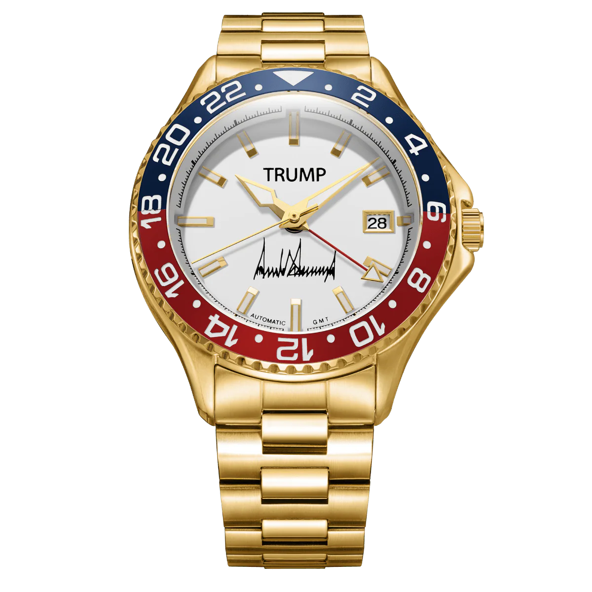 This limited edition Fight Fight Fight Watch is bold, gold, and tough - just like President Trump. Plated with the President's favorite material, 18 Karat Gold, it features his signature on the dial. This statement piece is unmistakable. The dial itself is made with a smooth white dial, elevating this piece to a true symbol of elegance and class. We've gone for a red & blue accent colors as a reference to the colors of the American Flag.