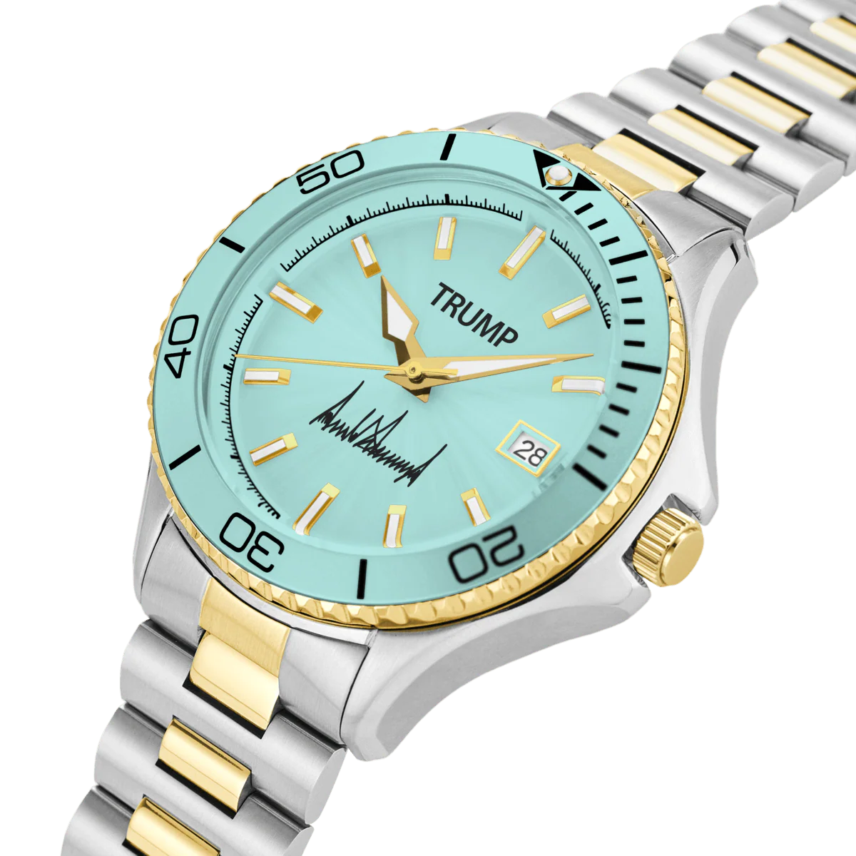 Introducing The First Lady, a stunning new women's addition to our collection. Featuring a sophisticated "Turquoise Blue" face and bezel. This limited edition of only 100, numbered timepiece embodies elegance and style, a true standout. Designed for women who appreciate luxury and exclusivity. With its chic color and meticulous craftsmanship, The First Lady is the ultimate statement piece for those who demand nothing but the best. Let the world know you stand with Trump, and do it in style.